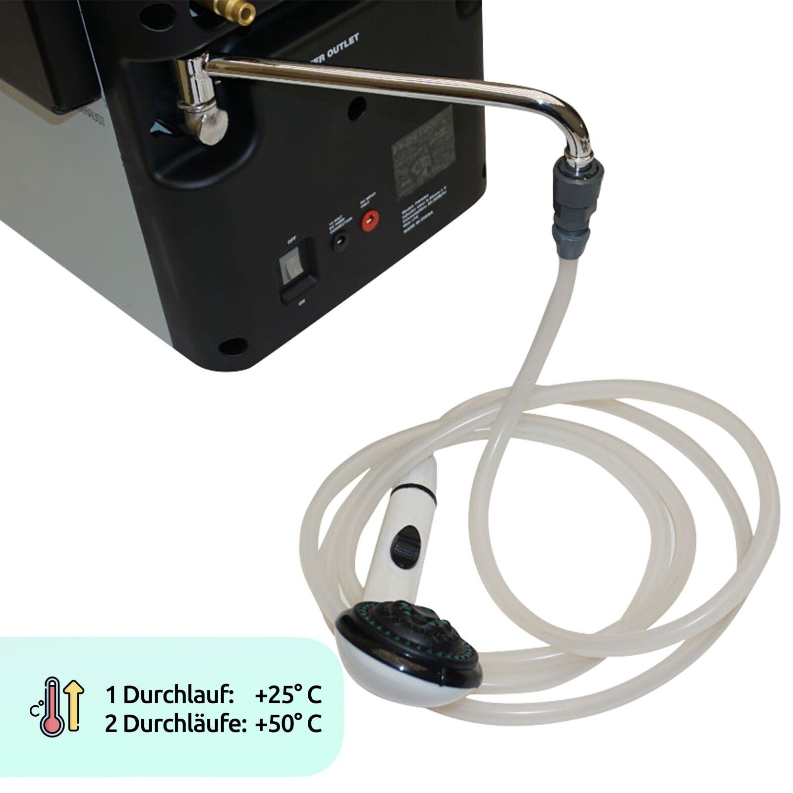Der Durchlauferhitzer wird mühelos über einen Zigarettenanzünder mit Strom versorgt, um die Zündung und die leistungsstarke Tauchpumpe zu betreiben. Für die Befeuerung wird eine handelsübliche Camping-Gas-Flasche angeschlossen, die für ausreichend Brennstoff sorgt.