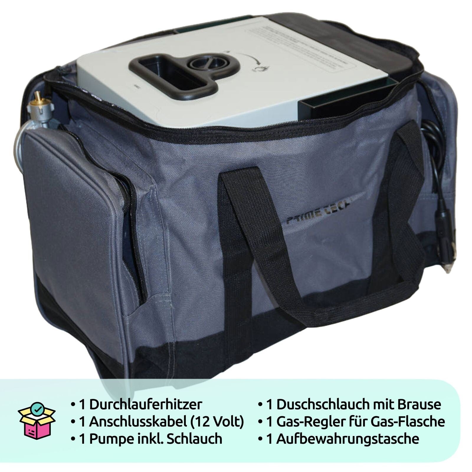 Im Lieferumfang sind alle benötigten Leitungen, Schläuche und eine praktische Duschbrause enthalten. Zusätzlich wird der Prime Tech Camping-Durchlauferhitzer mit einer robusten Aufbewahrungstasche geliefert, die einen einfachen und sicheren Transport ermöglicht.
